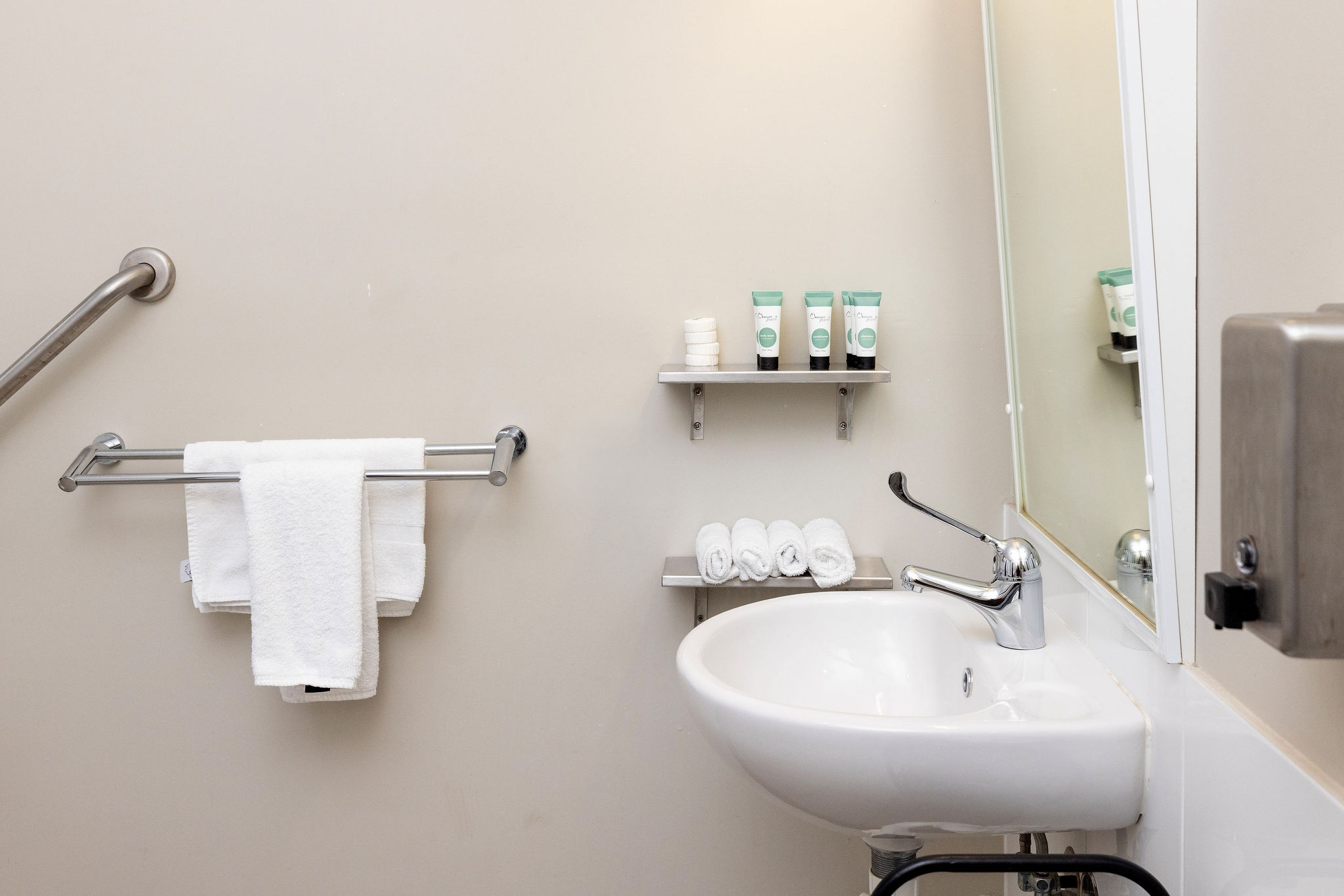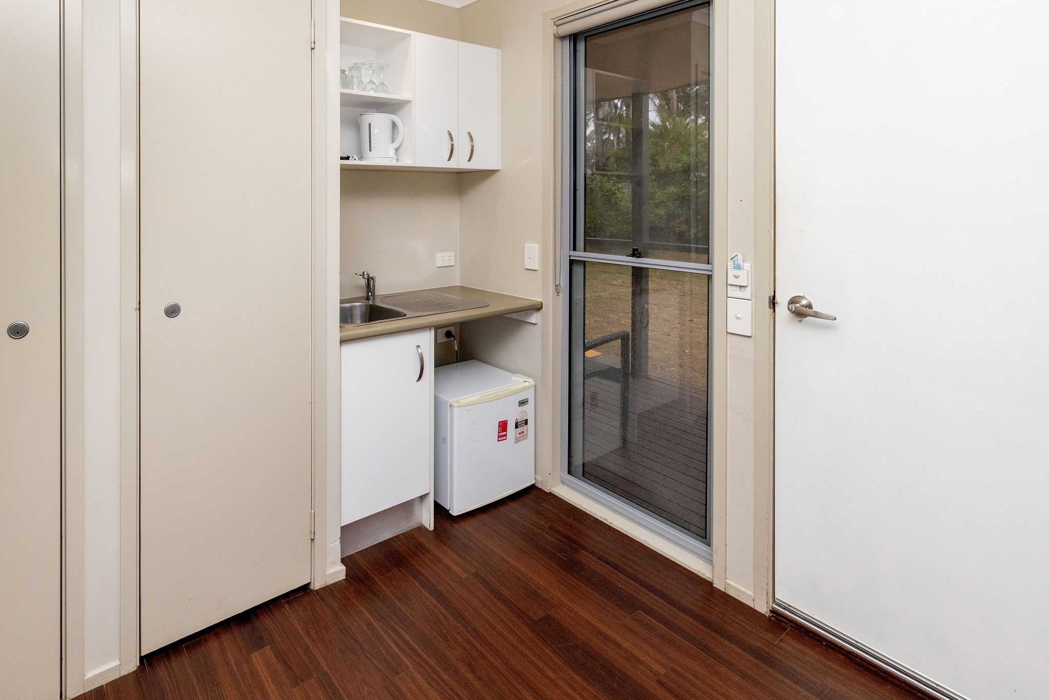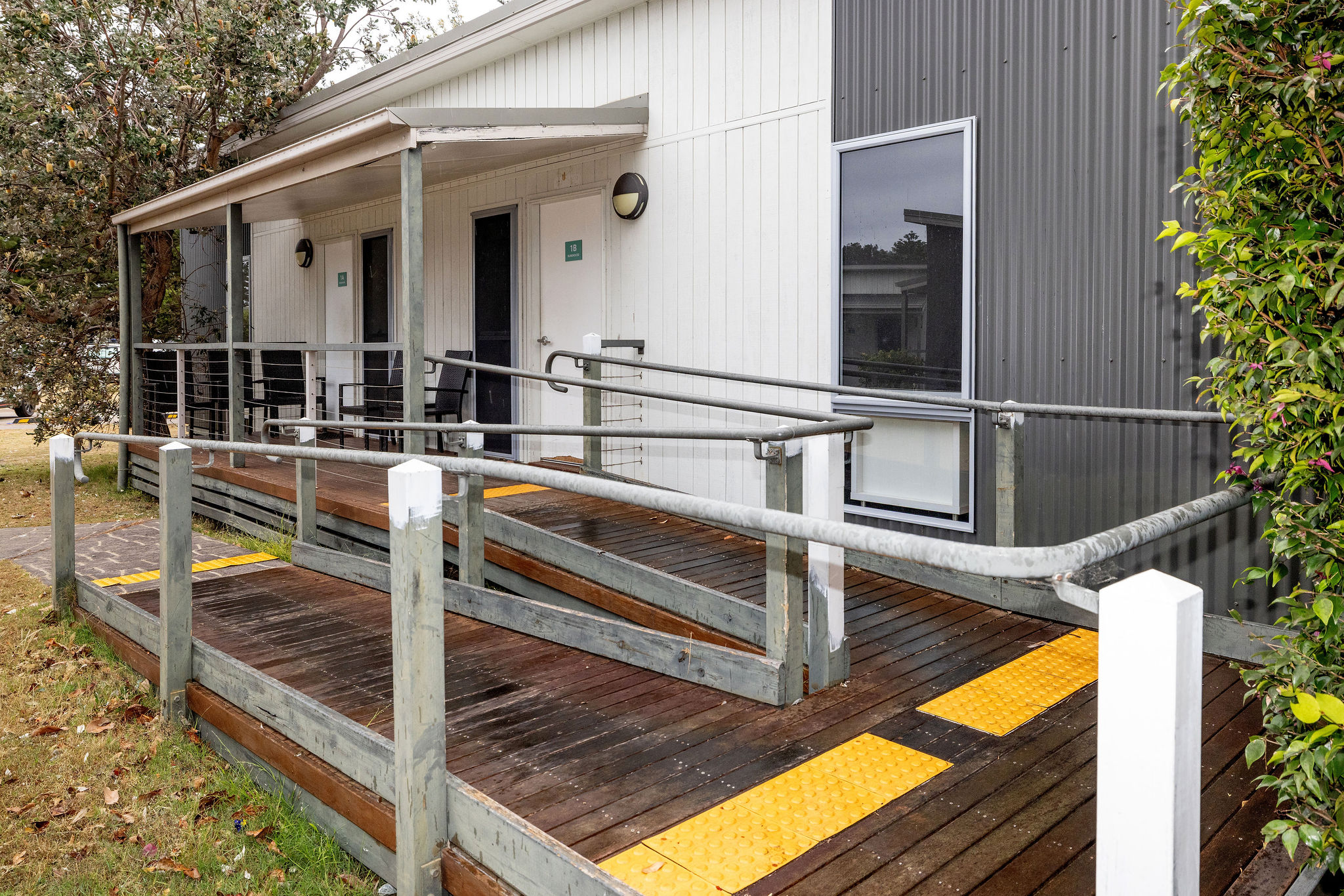 Dormitory style room close to camp kitchen and barbecues. Features an access ramp, four single beds, accessible bathroom and small kitchenette.