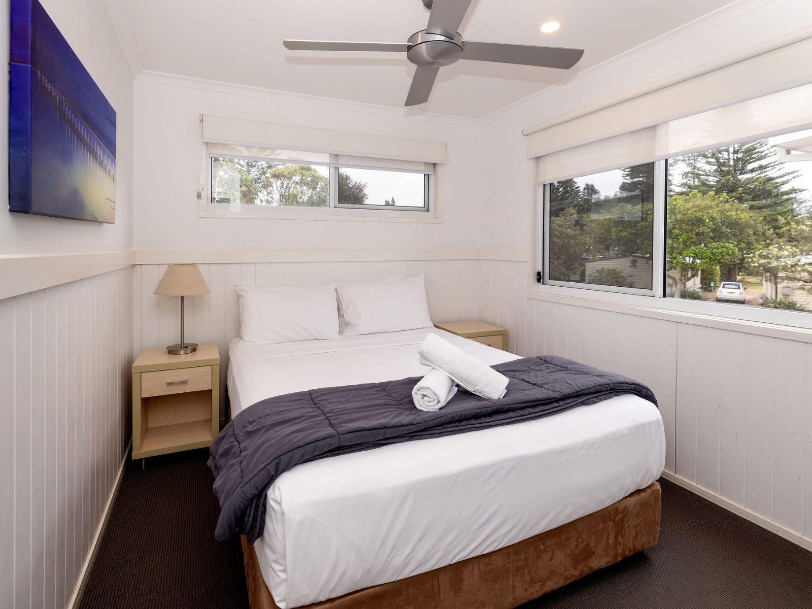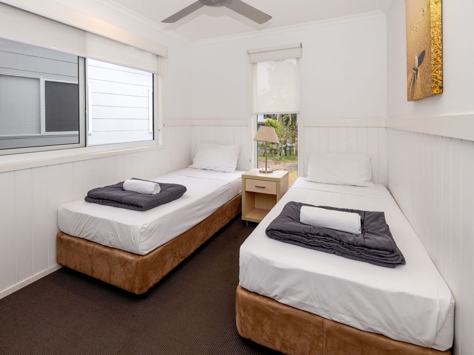 Cabin overlooking the lake. One queen and two singles. Suitable for a small family.