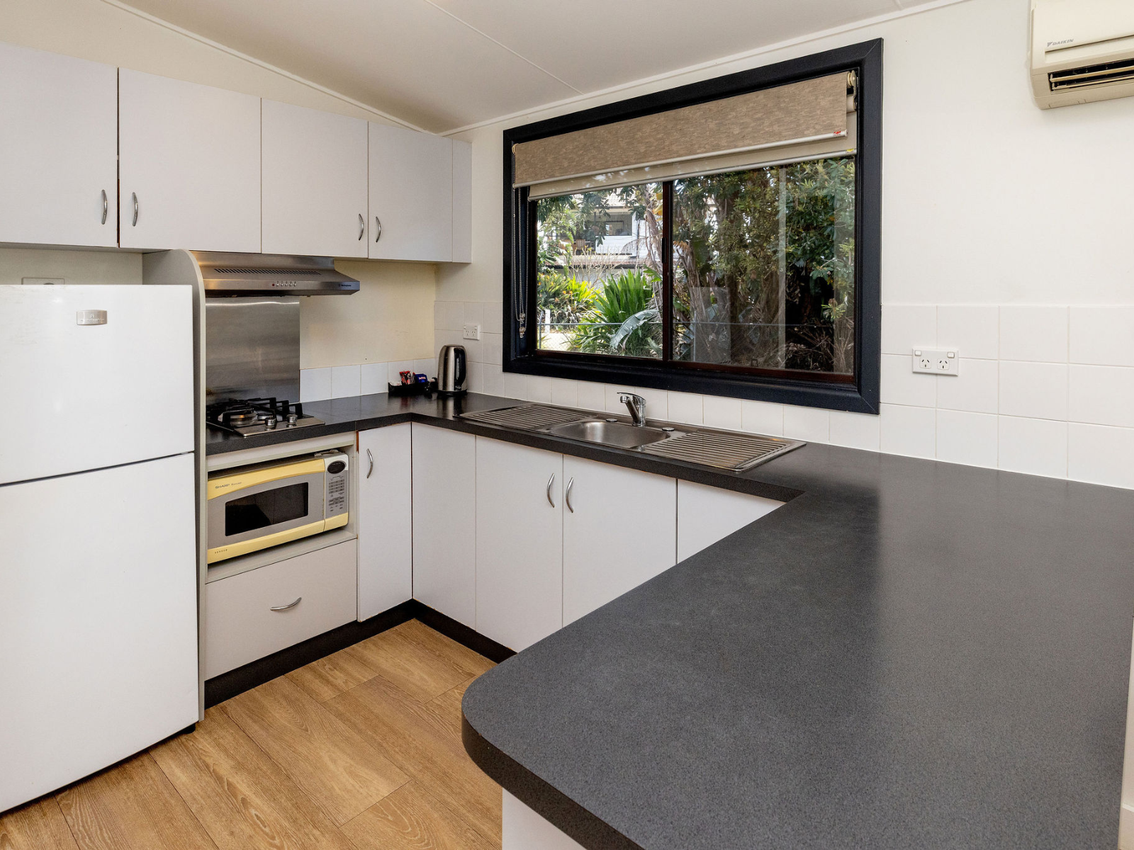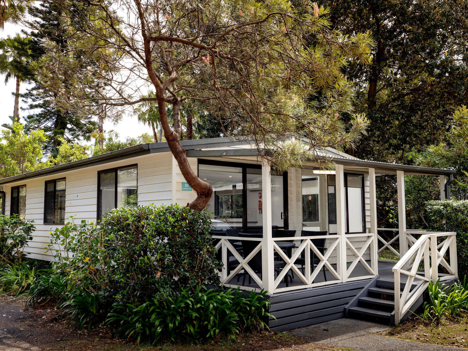 Garden view cabin. One queen and two single bunks. Suitable for a small family.