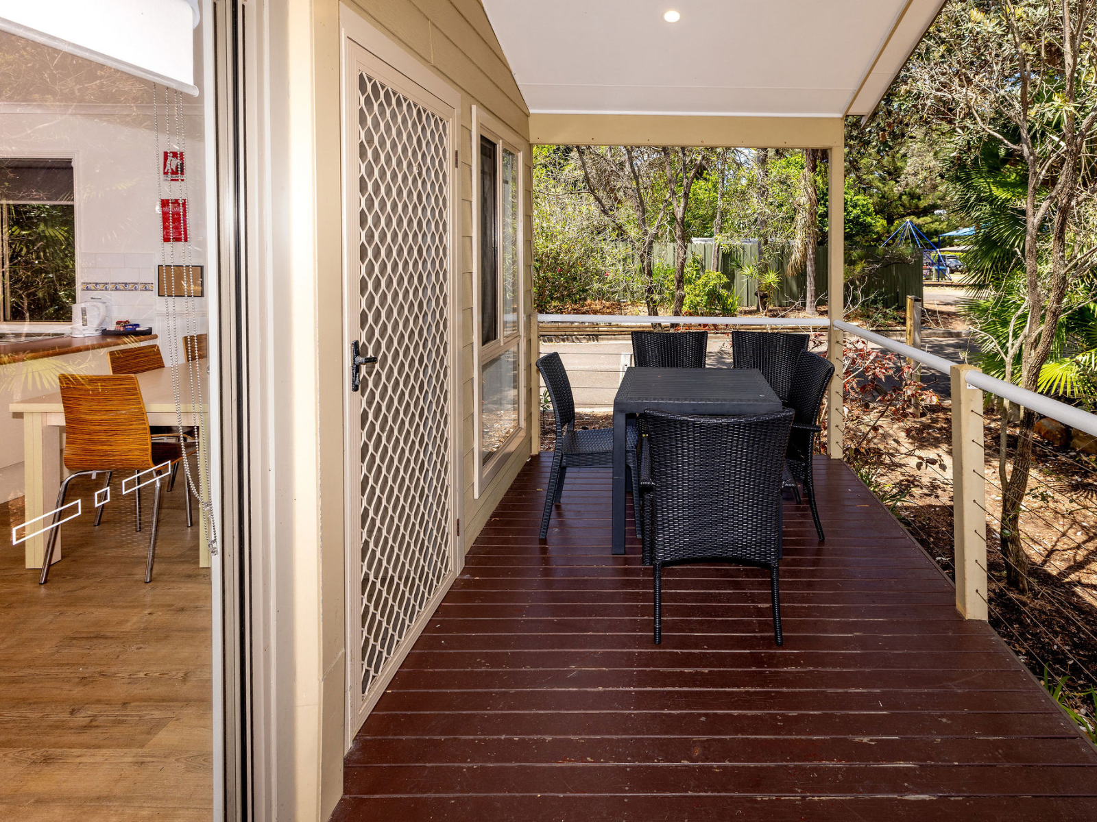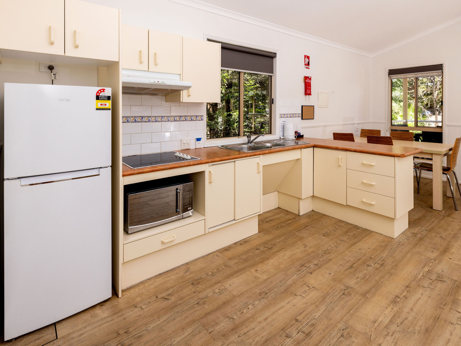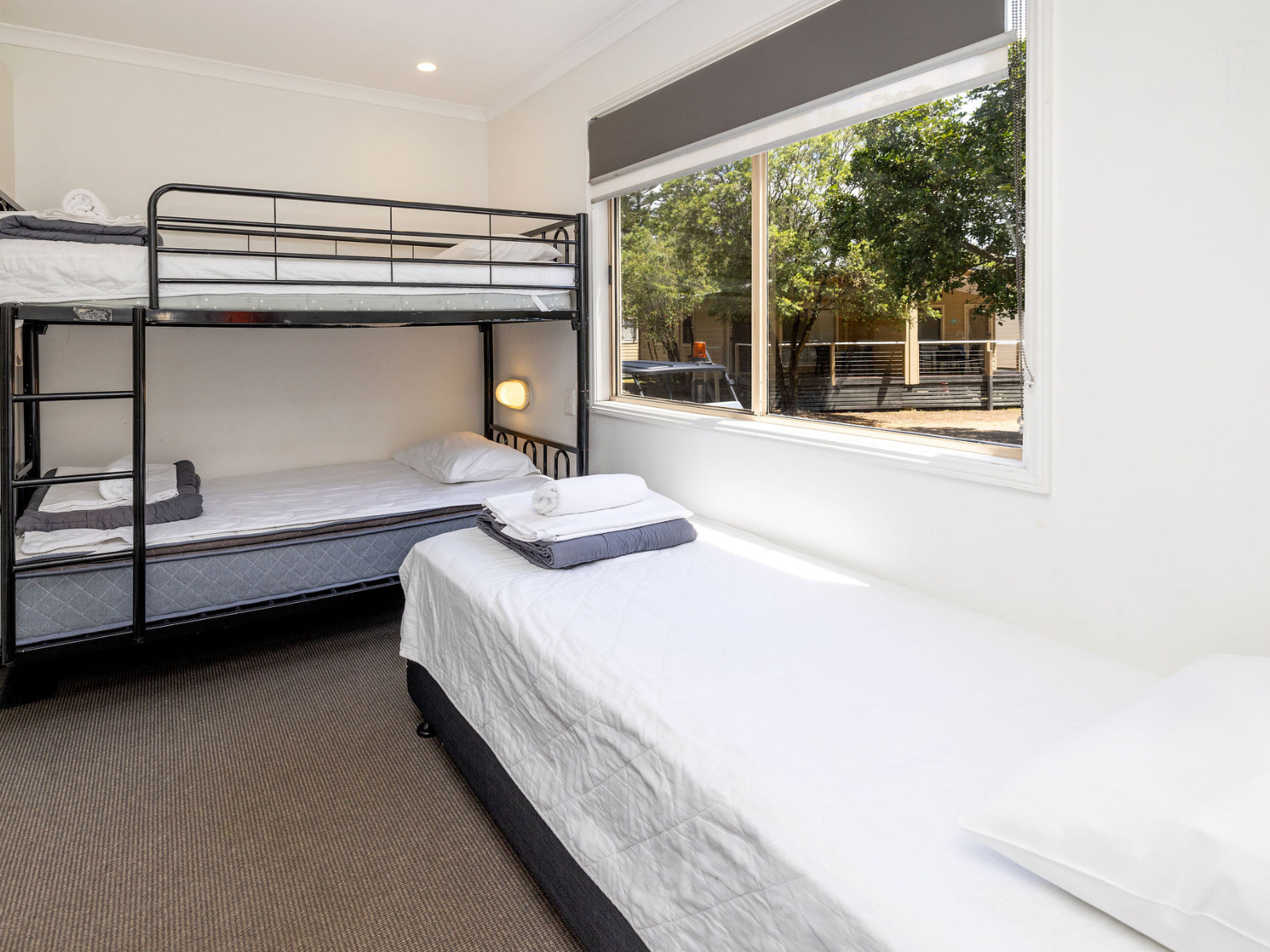 Garden view cabin. One queen, one child single (5’5) and one child bunk (5’5).